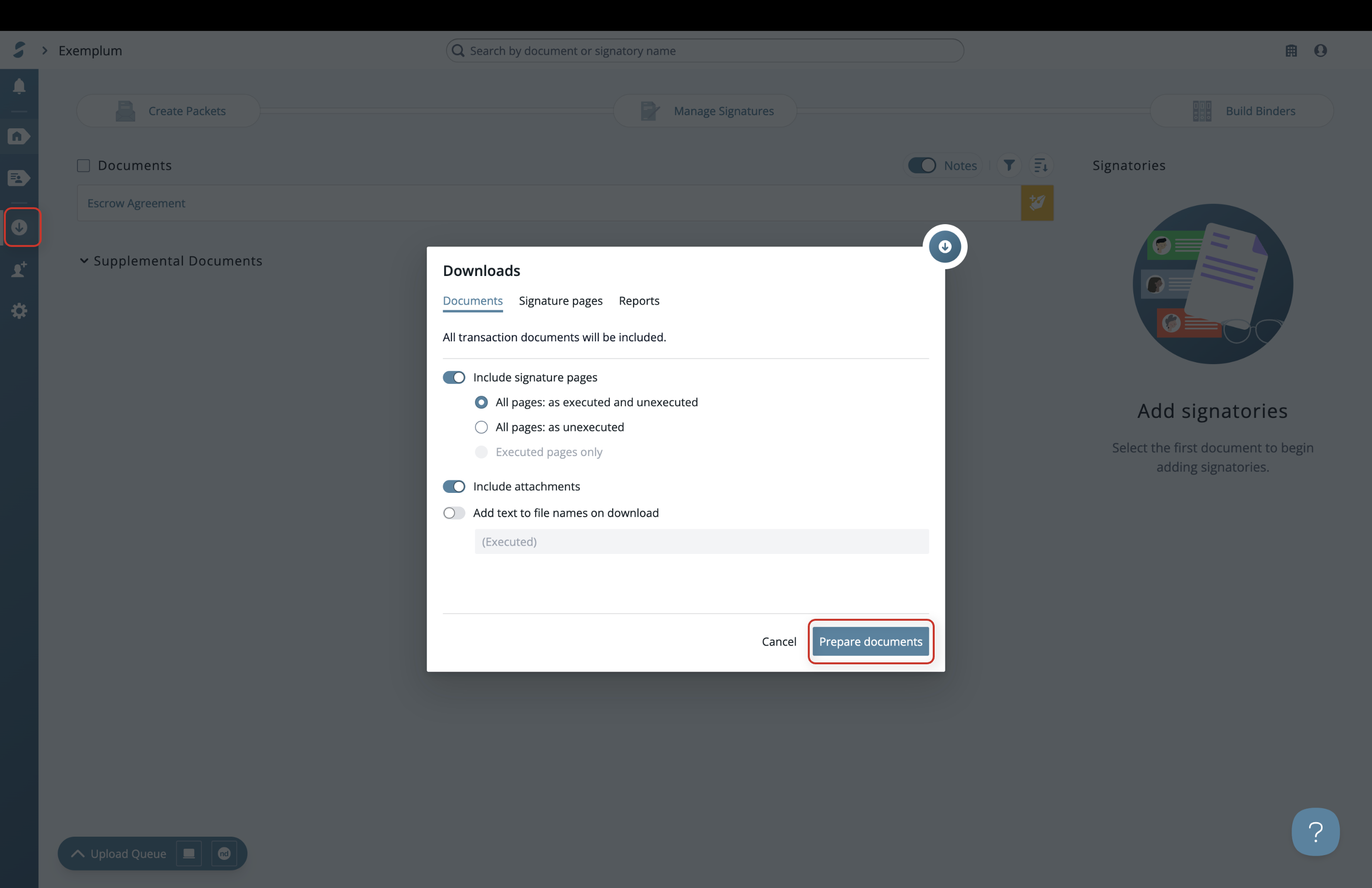 - A pop-up will appear with three tabs: one for documents, one for signature pages, and one for the reports.