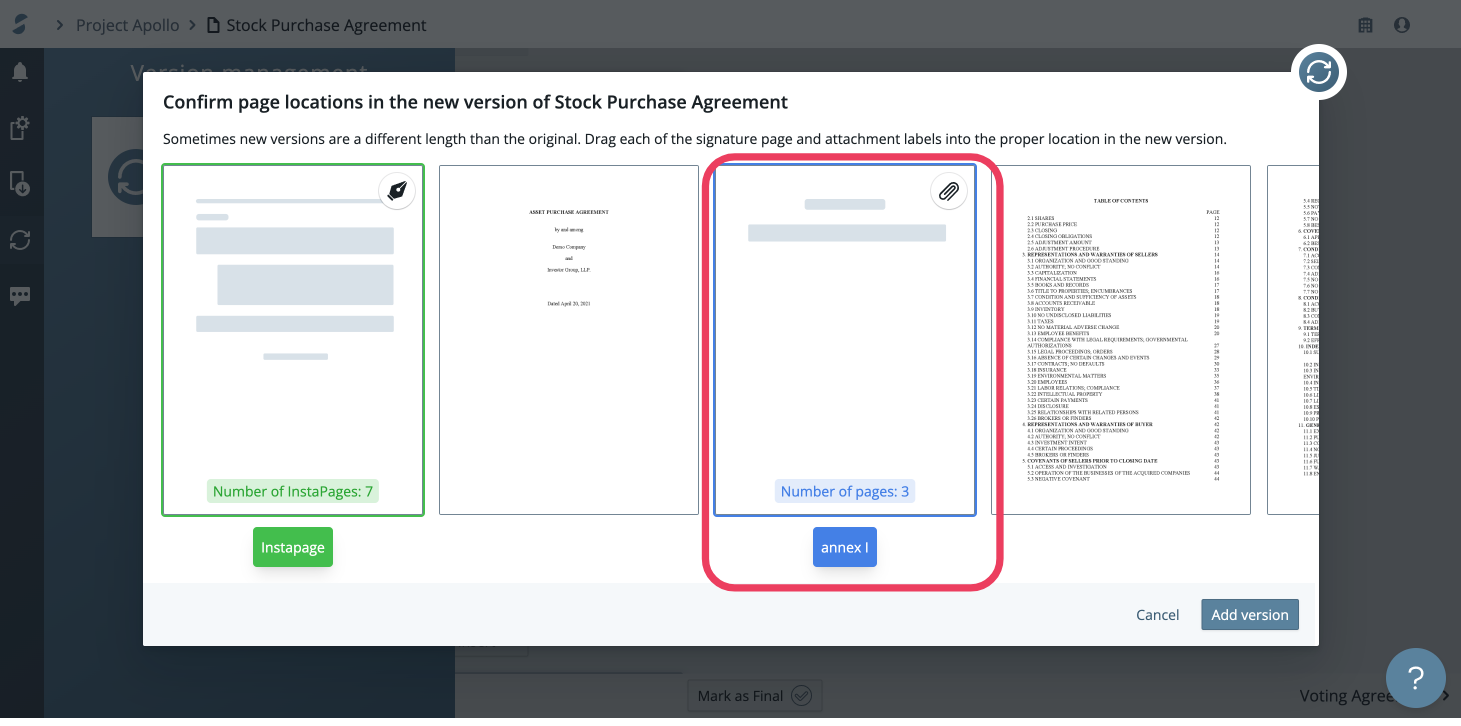 - If you would like to update the unexecuted signature page(s), click the toggle on the signature page thumbnail. This will show you the updated version of that page that will be applied when you click "Add version".