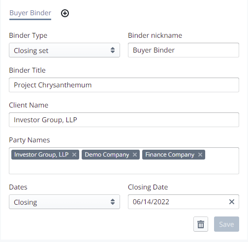 - Just enter your Binder nickname, title, client name, party names, and closing date