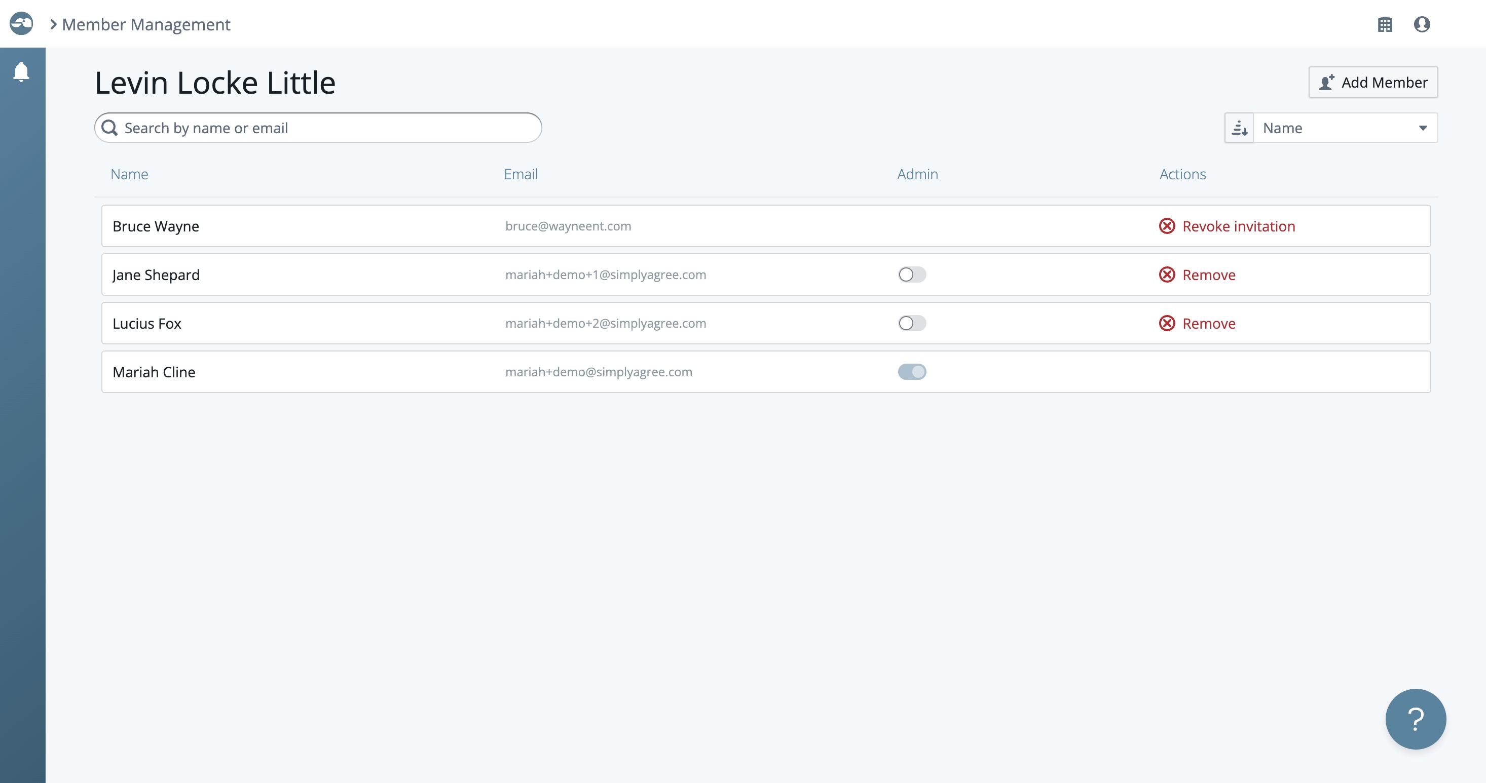 The member management page shows all the users in your firm's account. You can see their name, email address, if they're an admin, and you can remove them or revoke their invitation to join the account. You can also add members, sort, and search for members.