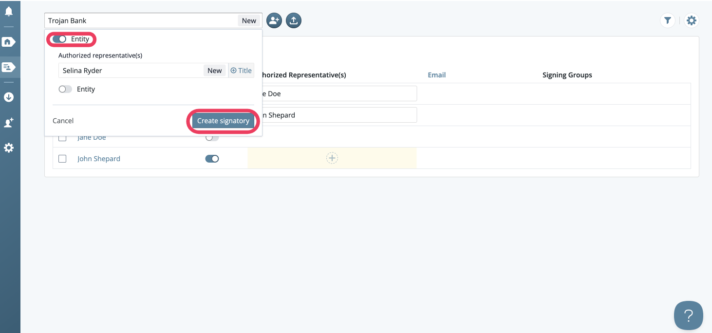 ” button OR click into the search field and start typing a new entity name. If it doesn't match an existing entity, you can click the create signatory button from there.- Once you've entered the entity name, turn on the