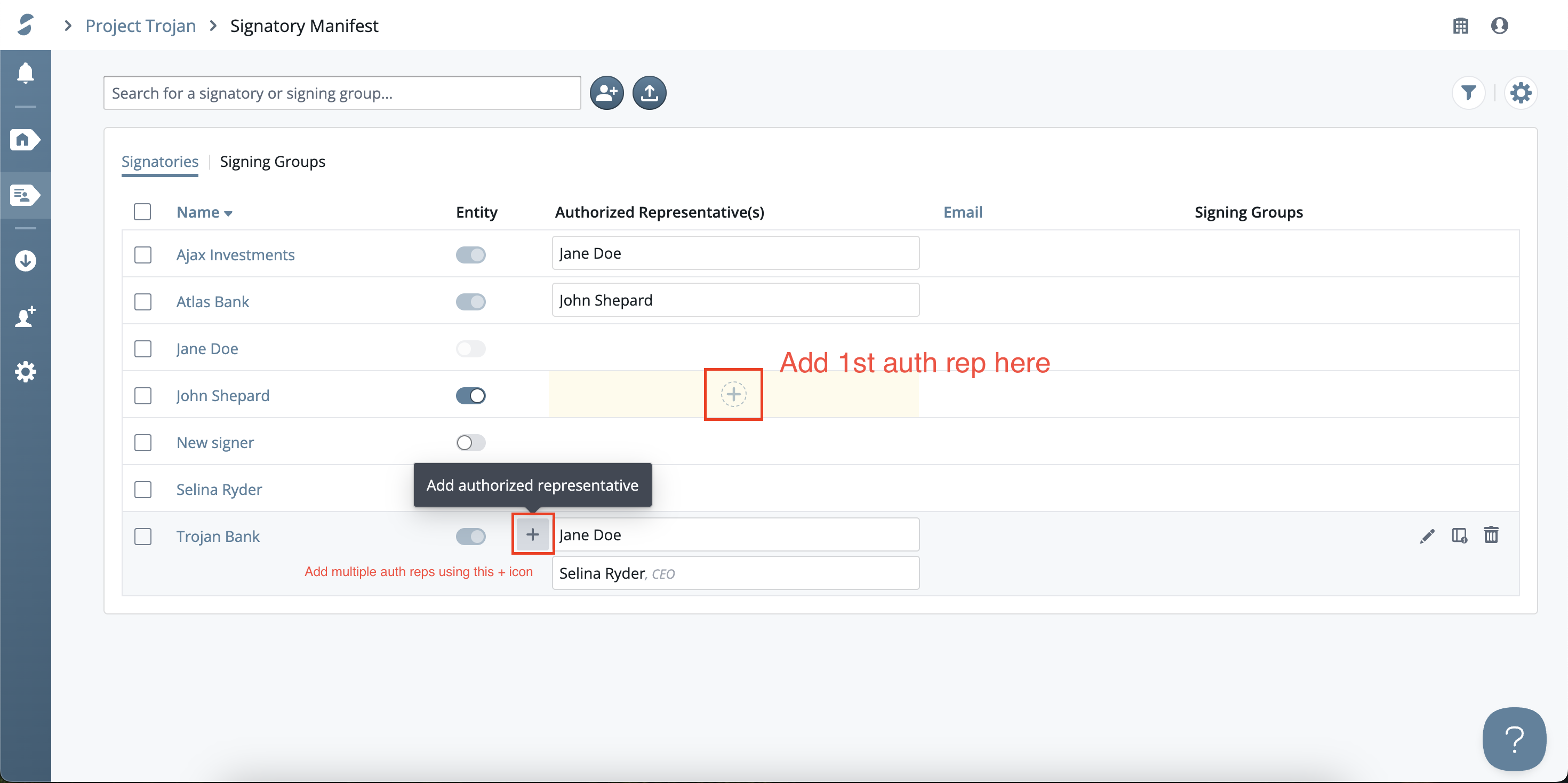 If you have multiple authorized representatives signing on behalf of a single entity, it's quick and easy to add them on the Signatory Manifest page.