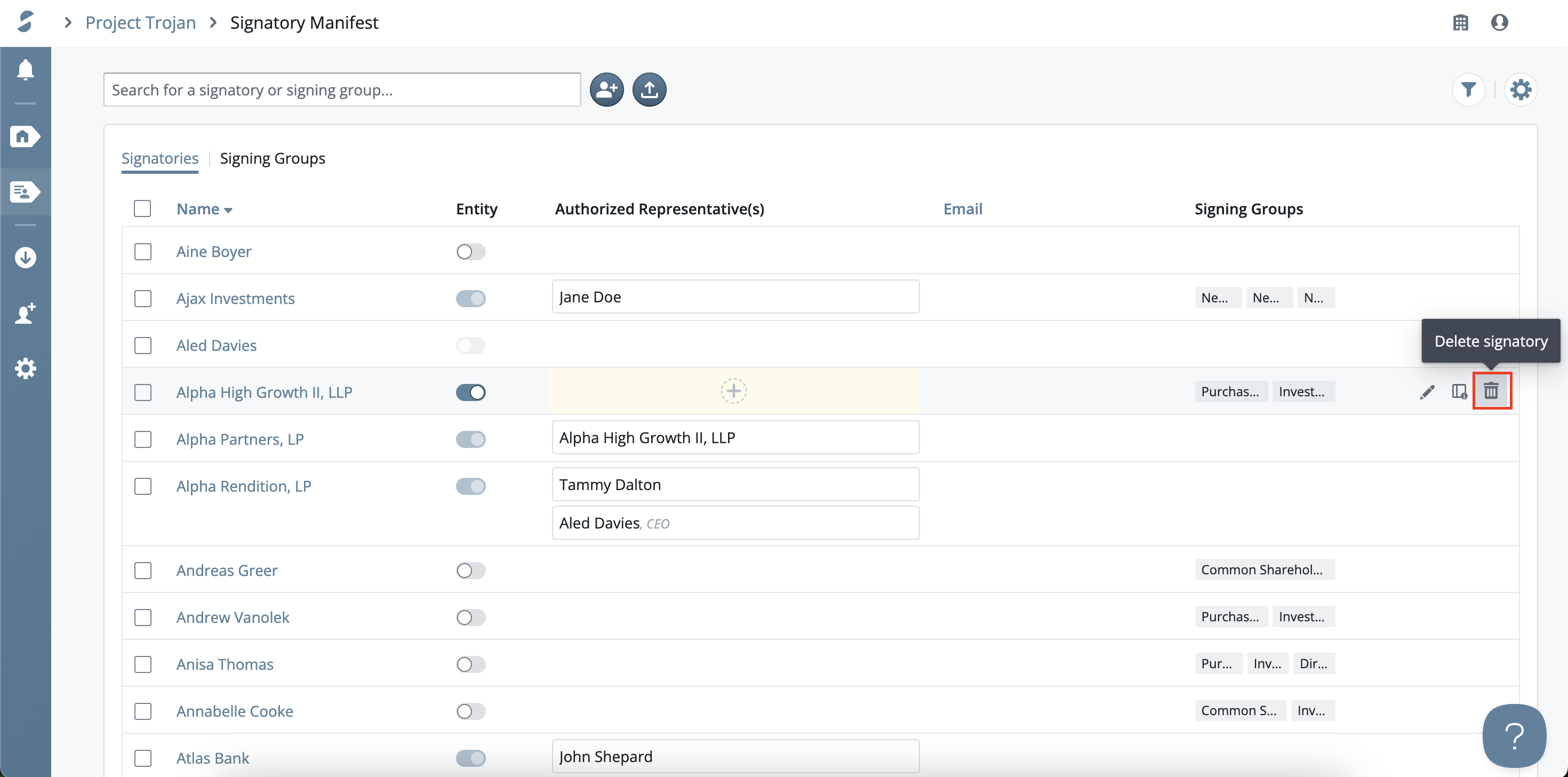Please note: that deleting a signatory from the manifest will also delete them from any signature pages they’ve been assigned to. Those signatory pages will be deleted from the Create Packets page as well.