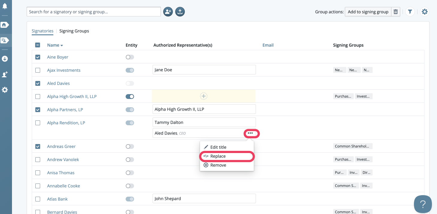 - Hover over the auth rep you want to replace and click on the