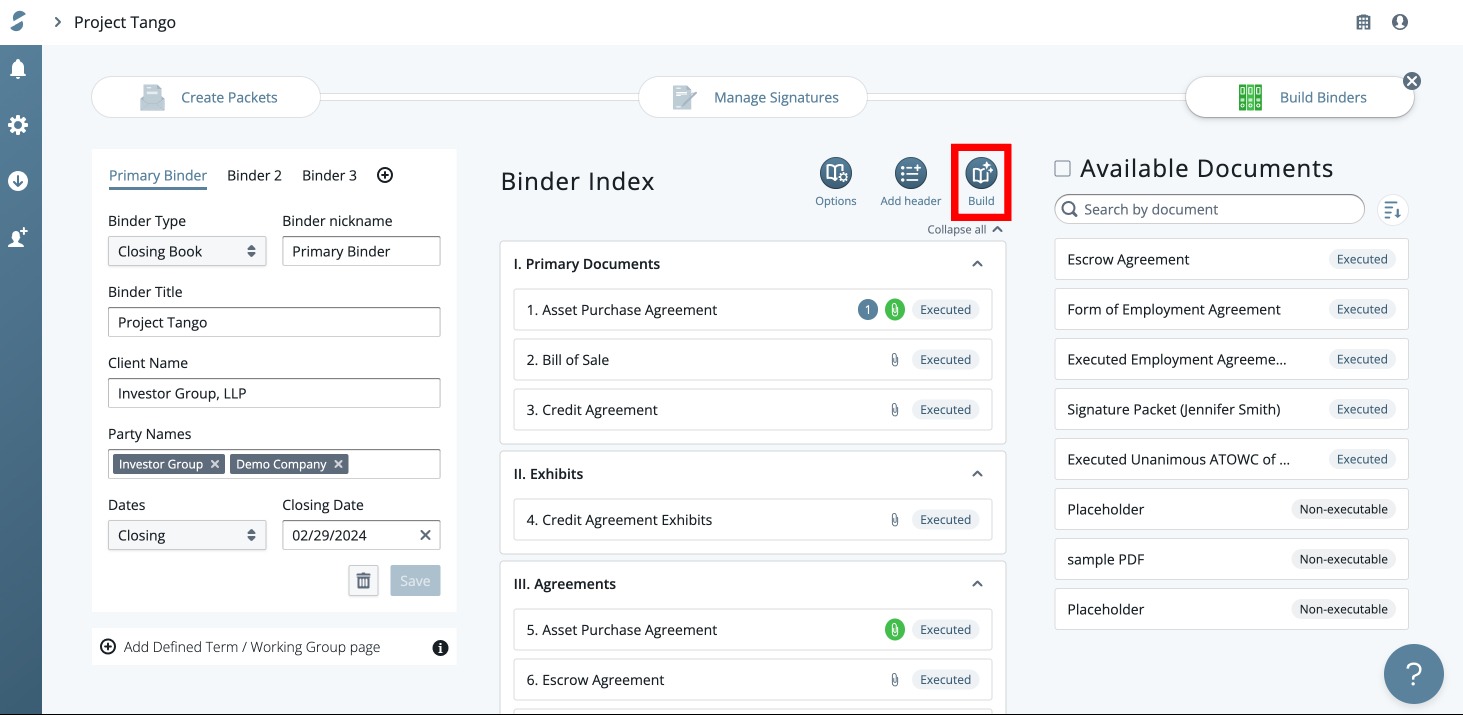 Once your cover page and index are built to your satisfaction, the only step left is to compile the binder. Simply click the Build button to start the compilation process.