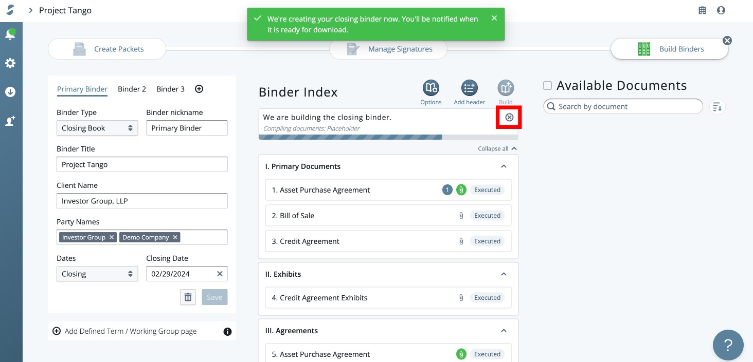 If you'd like to cancel your binder build part way through, just click the 'x' on the progress bar.