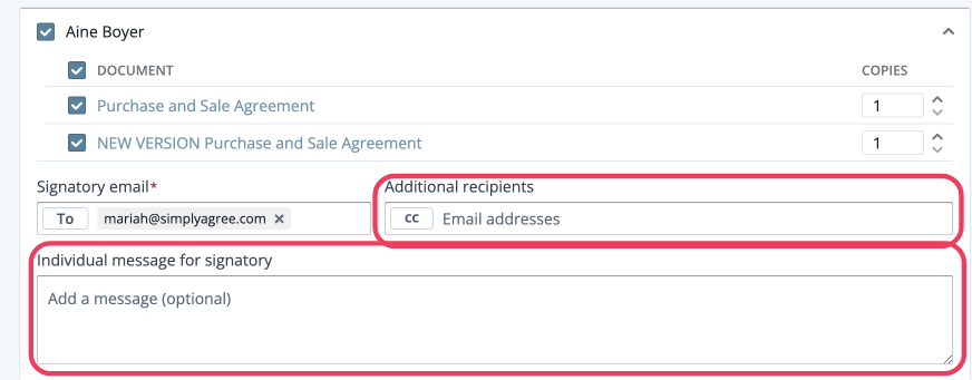 - The information you've added under the Messaging header will appear in the "Additional recipients" and "Individual message for signer" fields for each selected signatory