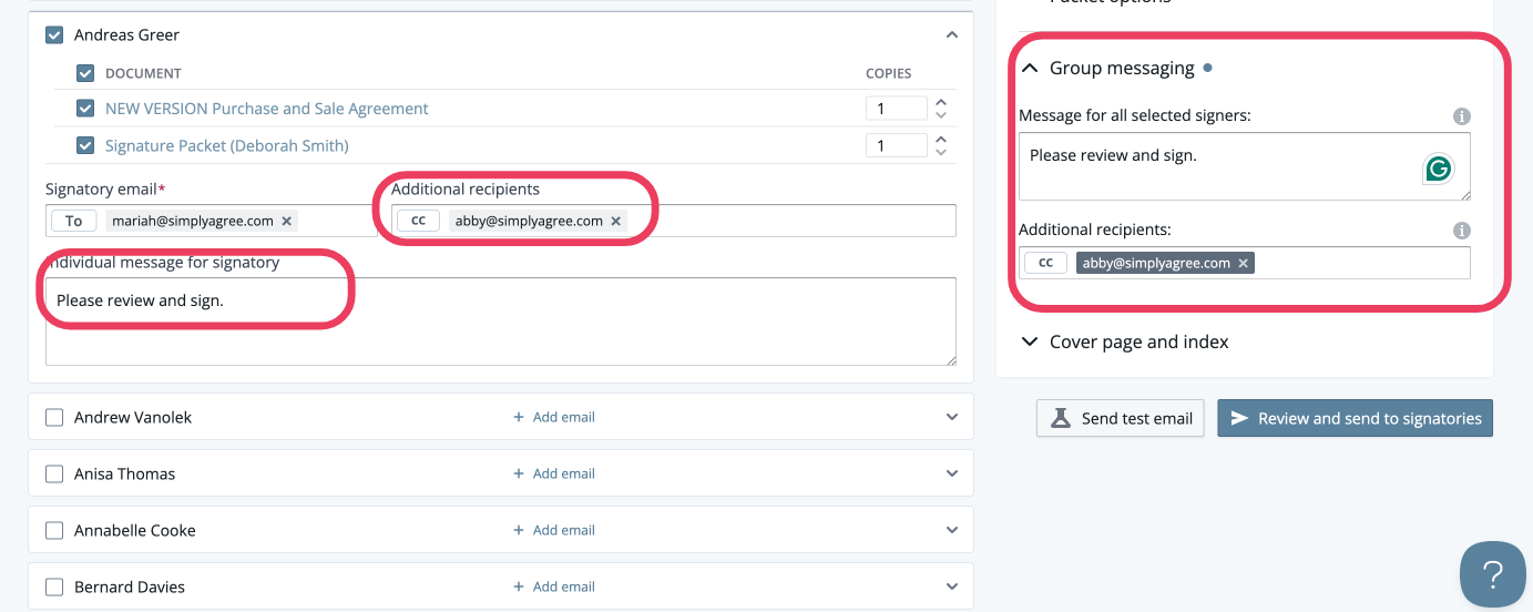 section - Add the cc'd individuals and message for each of your signatories