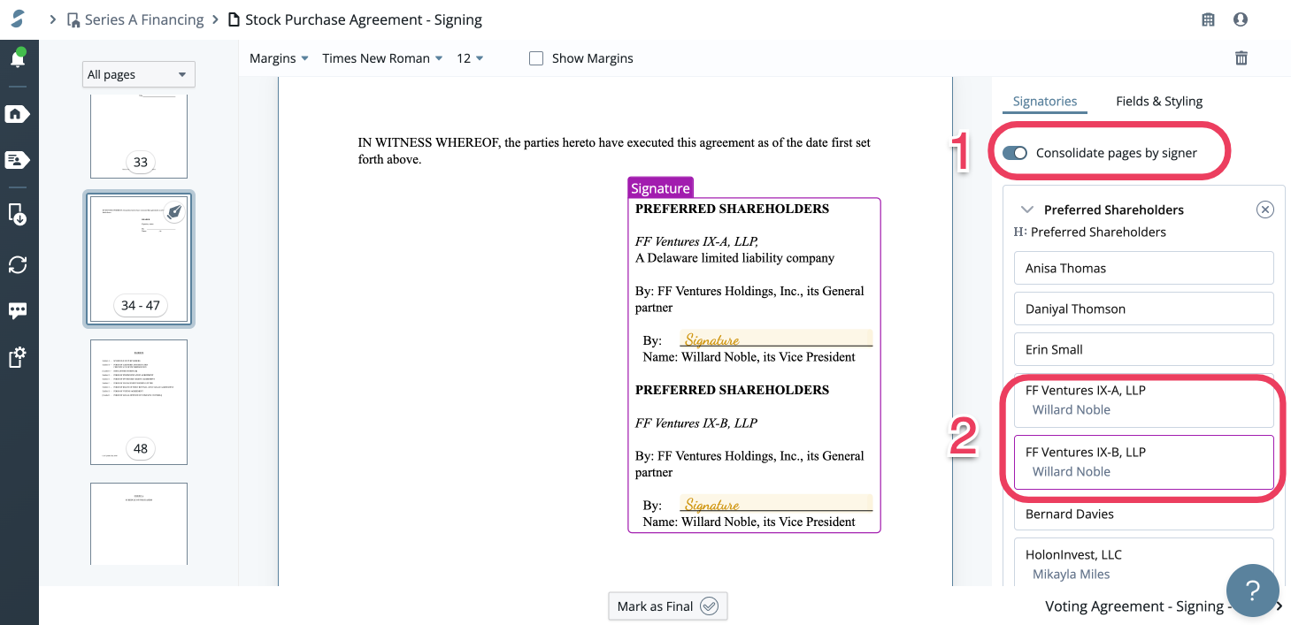 If you have a signer signing the same page in multiple capacities, you have the option to consolidate those signature blocks into the InstaPage, rather than in counterpart. If there are more consolidated signing blocks than fit on one page, they will spill over into additional pages. You can only consolidate pages by individual signer.
