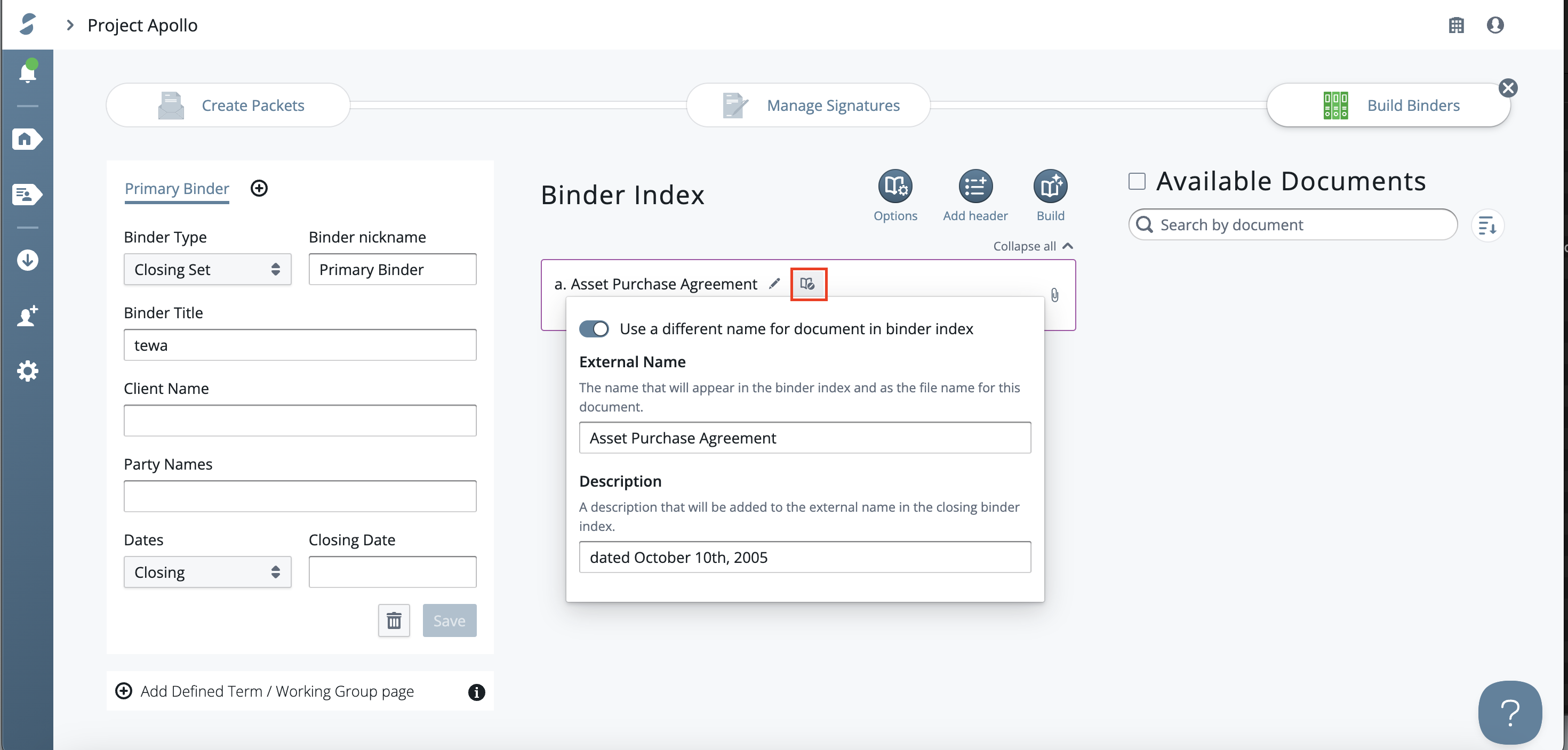 - On the Build Binder page, hover over the document card you'd like to add an alternate name to