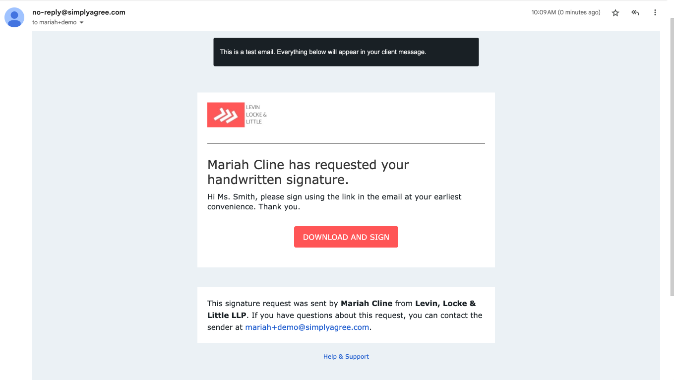 You'll receive a test email that shows what your client will get when you send the real packet. This test email doesn't contain the signing link and is strictly a preview of the email.