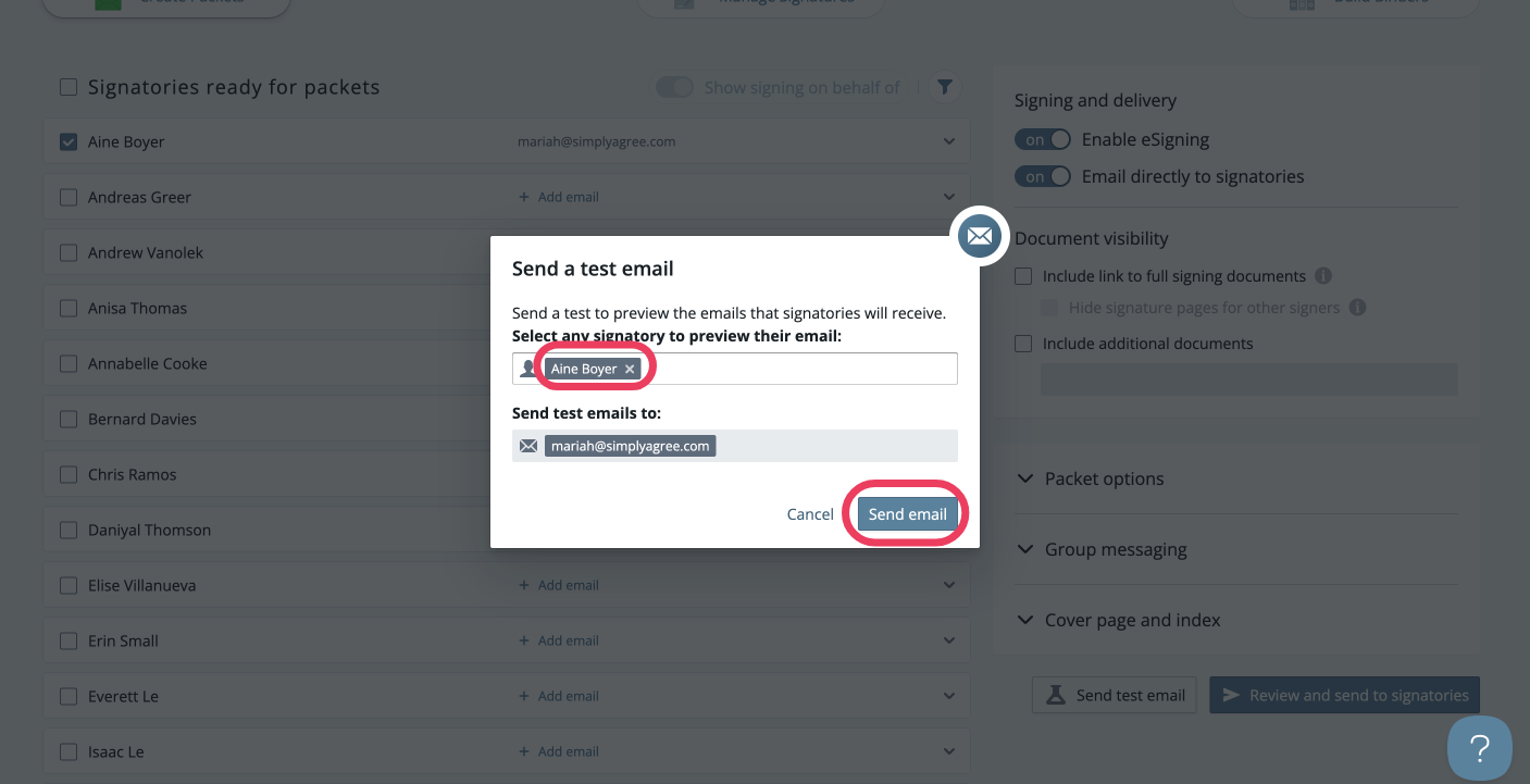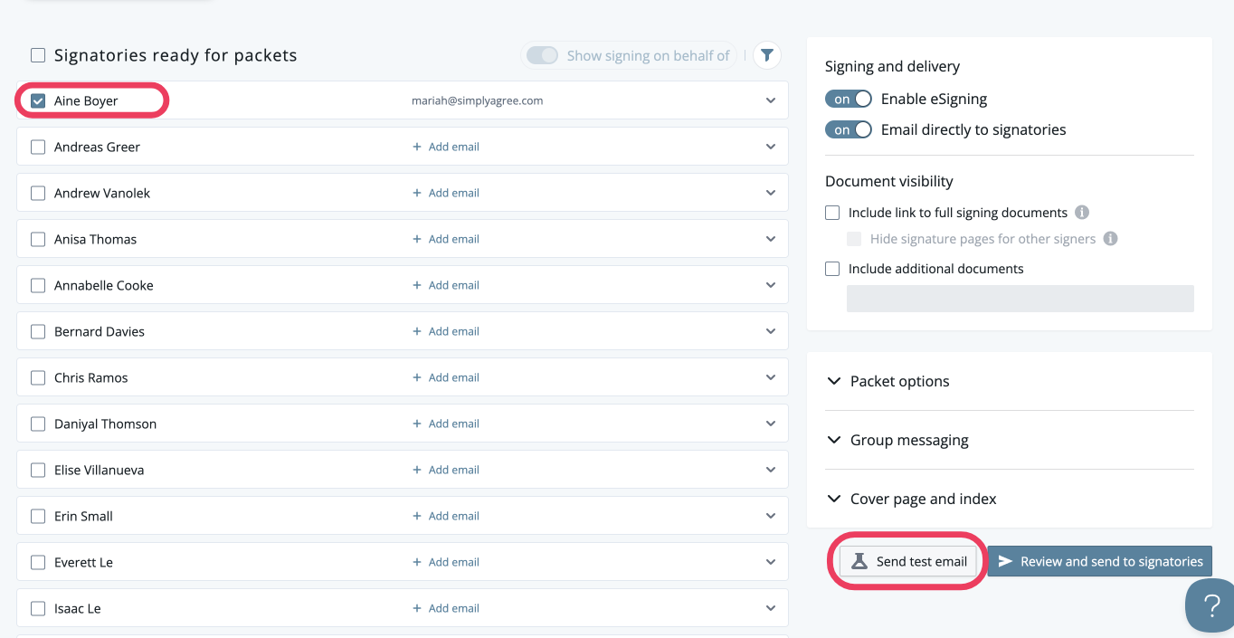 Once a packet is ready to be sent directly to the signer, you can send yourself a test email to preview the emails that signatories will receive.