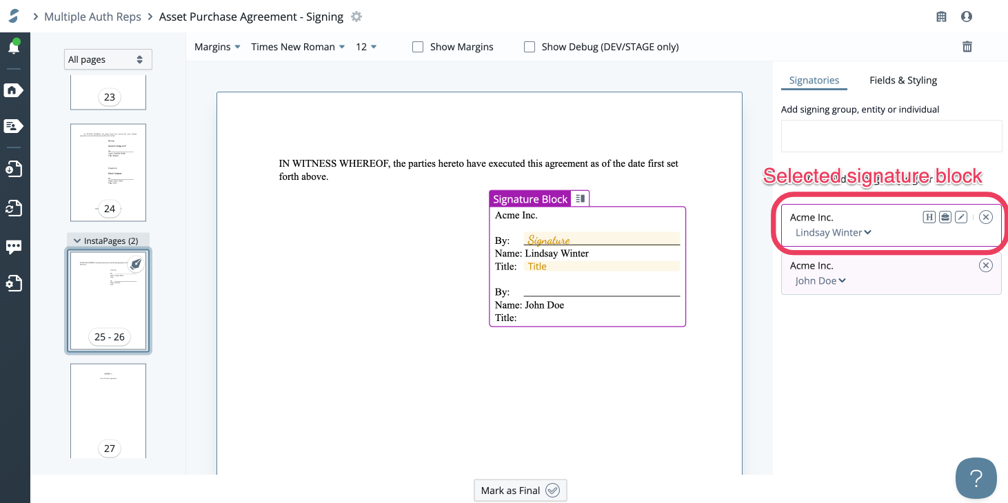 When using InstaPages and you have multiple authorized representatives assigned to the same entity, both signature blocks will be displayed on the same page. Each signature will still be signed in counterpart — one signature per page — but both signature blocks will be on each page. This is the default behavior for multiple auth reps on InstaPages. The signature card you select will be outlined in purple, and any other auth rep's cards will have a light purple background.