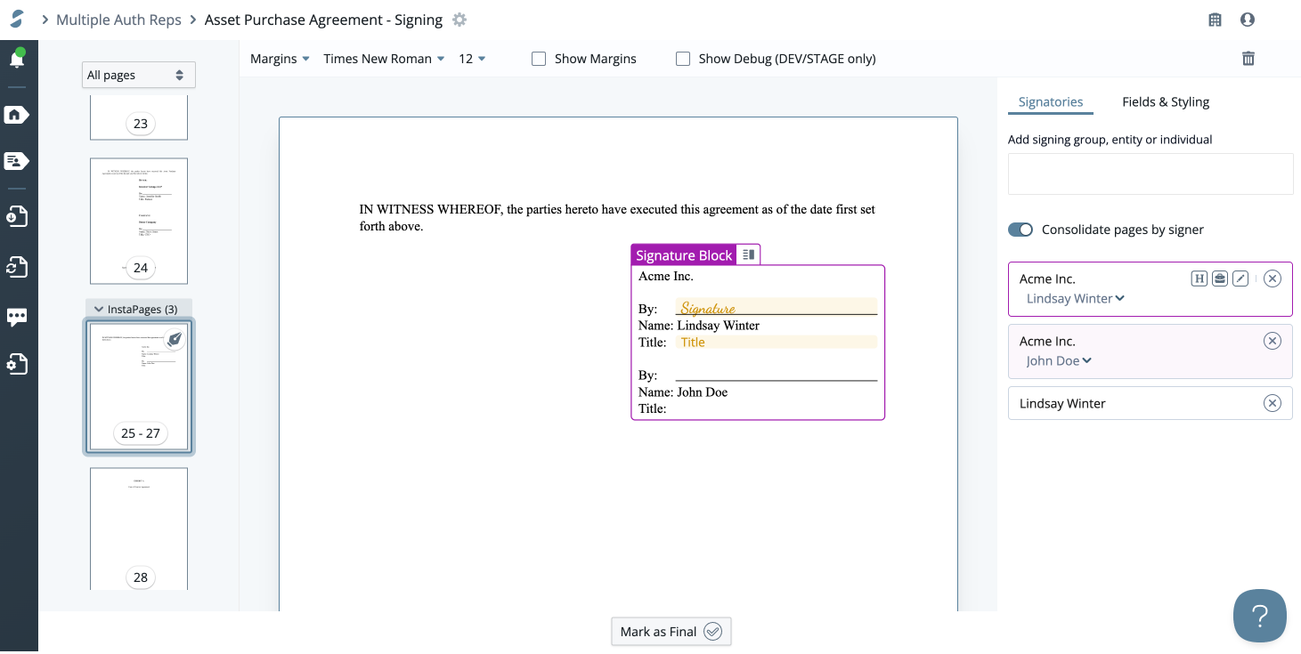 If you have multiple auth reps for the same entity, and you turn on consolidate pages by signer, the pair of multiple auth reps will be on one InstaPage, and any other signature blocks for that person will be on another InstaPage.