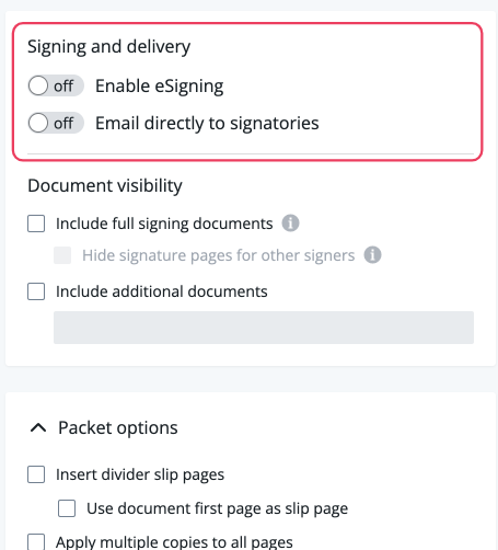 : converts the PDF packet into an eSign packet and allows you to add the eSign fields.Send directly to signatories