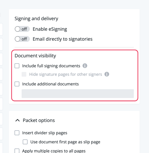 : Will show a signer only their own signature pages when they view the full document version. Only available when the full signing documents are attached.