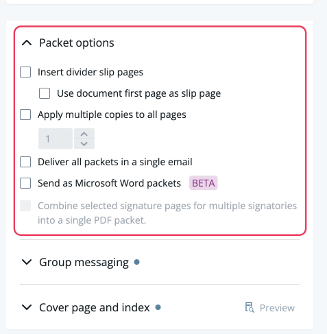 : This feature is in BETA. It will send the PDF packet as a Word packet insteadCombine selected signature pages for multiple signatories into a single PDF packet